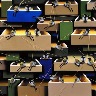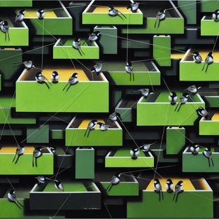 Jung Haiyoon has a unique painting technique that showcases the contemporary color palette of Korean traditional painting by layering oriental paints, gold, and silver powders on silk. She explores human relationships and communication, depicting the roles, obligations, and collective entities within those relationships. Using silk as the main material, she incorporates various backgrounds such as threads, drawers, pipes, and stones onto the canvas. Through imagery like opened or closed drawers, tangled or organized pipes, and birds holding thin threads on stones, she expresses the interconnectedness of human relationships in society. By portraying individual elements gathered together on one canvas, akin to how individual lives form a community, she reflects on human relationality in our lives and aims to discuss the diverse aspects of human life together.