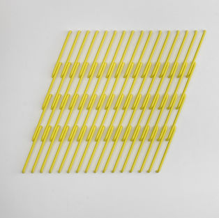 이화여자대학교에서 섬유예술 전공으로 박사과정을 마친 윤정희는 실과 파이프, 동선 등의 재료를 활용하여 조형적 질서를 구축한다. 조형의 기본 요소가 되는 선(line)을 해체하고 재조립한 뒤, 직선과 곡선, 반복되는 고리, 매듭 등의 형태를 만들어내는 윤정희 작가는 공간에 대해 탐구한다. 초기에는 구리선으로 이루어진 고리를 이용해 뜨개질하듯 망을 엮어내던 작가는 차가운 금속으로 따뜻함을 만들어내고자 했으며, 머리카락 굵기의 구리실은 같은 속성을 지닌 금속 파이프와 구리선의 연장선인 실로 확장되었다. 물질의 본질을 탐구하는 이러한 실험적 접근 방식은 공예적 섬세함과 조각적 구조성을 결합한 시각적 리듬을 형성한다. 작가의 작품은 조각이지만, 벽에 부착되거나 선반 위에 놓이며 중력의 법칙에서 자유로운 형태로 존재한다. 동시에 바닥과 좌대의 물리적 경계를 초월하여 공간 전체로 확장되려는 조형적 의지를 내포하고 있다. 윤정희의 작업은 이처럼 공간과 상호작용하며, 유기적인 형태는 동적인 생명력을 함축하고 있다. 나일론과 털실이 파이프의 중심을 따라 층층이 쌓이는 방식으로 제작되는 그의 작업은 유기적인 흐름을 만들어내고, 색과 리듬을 통해 조각적 요소와 회화적 요소를 동시에 함유한다. 밝고 부드러운 색감을 지닌 원통형 오브제들은 차가운 공간 속에서 온화한 감성을 자아내며, 연속적인 선들은 리드미컬한 율동감을 형성하여 공간의 분위기를 변화시킨다.