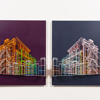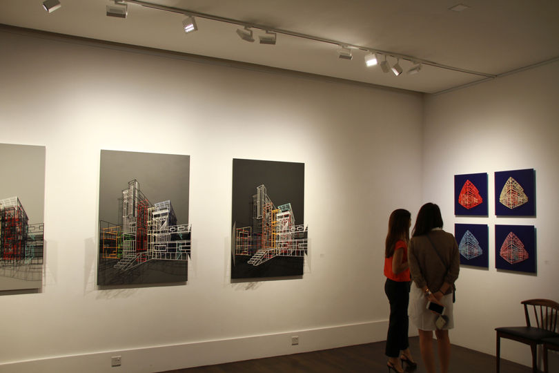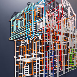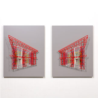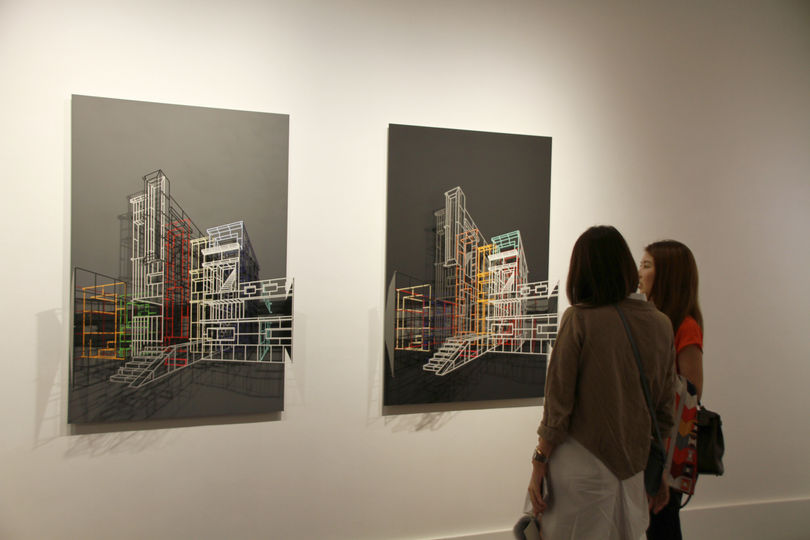 Kim Byungjoo’s initial works began from the artist’s curiosity about closed spaces; infinitely numerous iron structures are welded to create grids which generate planes, which in turn make up invisible spaces that can be peered into from the netted formations in the grid. In all, these early works were closer to minimalistic architectural structures that focused on the void spaces. The sculptor has been focusing more on relief sculpture since his solo exhibition in 2013, in which he takes laser-cut architectural structures and reconstruct them on a uni-color boards to generate a harmonious and multi-dimensional architectural forms and spaces. His focus is on the spaces created by overlapping ambiguous lines without the distinction between the interior and the exterior. Kim continues to deal with spatial concepts with new perspectives; recently, he uses different colors for different layers to maximize the harmony of structures put together in a complex and fitting manner. This is not done in an impromptu fashion, either. The artist uses a computer program in the early stages to plan for colors and other basic matters, in an attempt to warm up for the main game. As the exposed form with a quiet existence combines with the hidden beauty to create an order of harmony and cadence that blooms, this process of change is born under a strict planning and strategizing by the creator, rather than instant intuition. If the development of mass consumer culture was inevitable since the advent of the Industrial Revolution, the repetition through duplication was another exit for the artists who were looking for a new form of expression. Aestheticians also published artistic theories of such era of mechanic circulation to legitimize such attempts by the artists. At the time, Walter Benjamin (a German philosopher, 1892-1940) understood “mass duplication” as a new way of exploring the origin of artistic works. Under this background, artists strategically utilized the artistic values of duplication and repetition, a typical example of which are pop art and minimalism. In the time to come, such duplicity and repetitiveness gradually came to be expressed in the overall society as well, and an example of such manifestation is architecture. Kim Byung Joo forms architectural images by arranging repeated lines or duplicating structures with the same form multiple times. Going further, he also uses duplication to maximize the visual elaboration and overlaps. Such process of re-production facilitates the handling of concepts about space from a new perspective. While it is easy to show objects, it is difficult to hold the attention of the audience. The attention of viewers who first come across Kim Byung Joo’s is busily focused on observing layers and layers of structures. The audience is left astonished by the external reality of the physical space and fascinated by the meditative space generated by the introspection of the viewership.