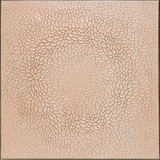 Kim creates his work by first filling the canvas with small black paper board pieces of various heights which are adhered to the plane in regular gaps under a meticulous plan. Next the paper is repeatedly layered then peeled off of oil paint or pigment powder making for an extremely arduous process. Lastly, a layer of metallic monotonous color is carefully laid out for a final touch. What starts as a somewhat busy-looking mass of innumerable lines soon transforms into an intellectually stimulating and elegant display of art. The end result is an artwork with the form of ‘Bas-Relief painting’ that goes beyond a flat plane painting. As such, it can be said that Kim creates something close to three-dimensional structure through an innovative use of a traditional painterly medium. This unique approach is a trademark that Kim has nurtured over the years. The countless short lines, erected meticulously, seem to fall in good order to produce various expressions. In effect this creates distinctive visual illusions of light and dark and of concentration and dispersion, which contrast to form wave-like vibrations that resonate with the primordial visual instincts.